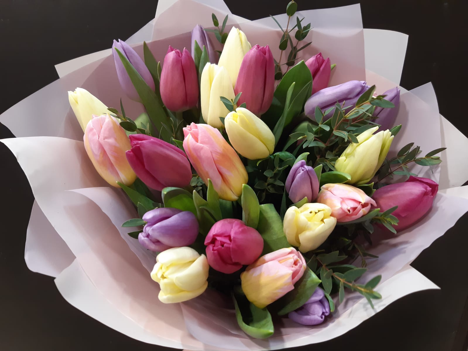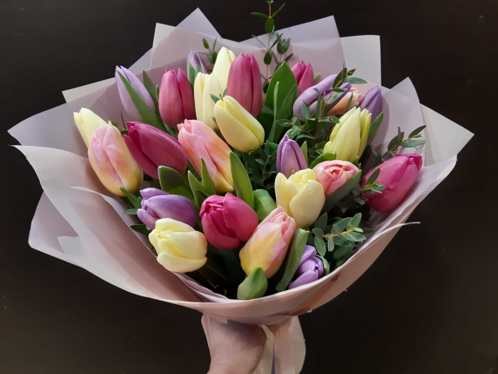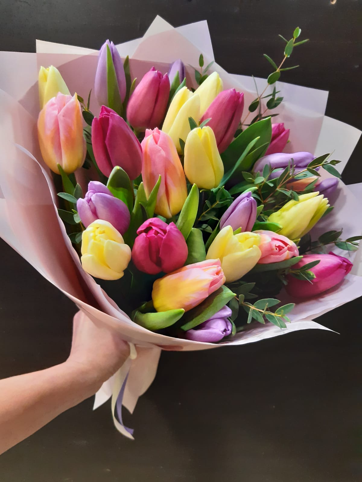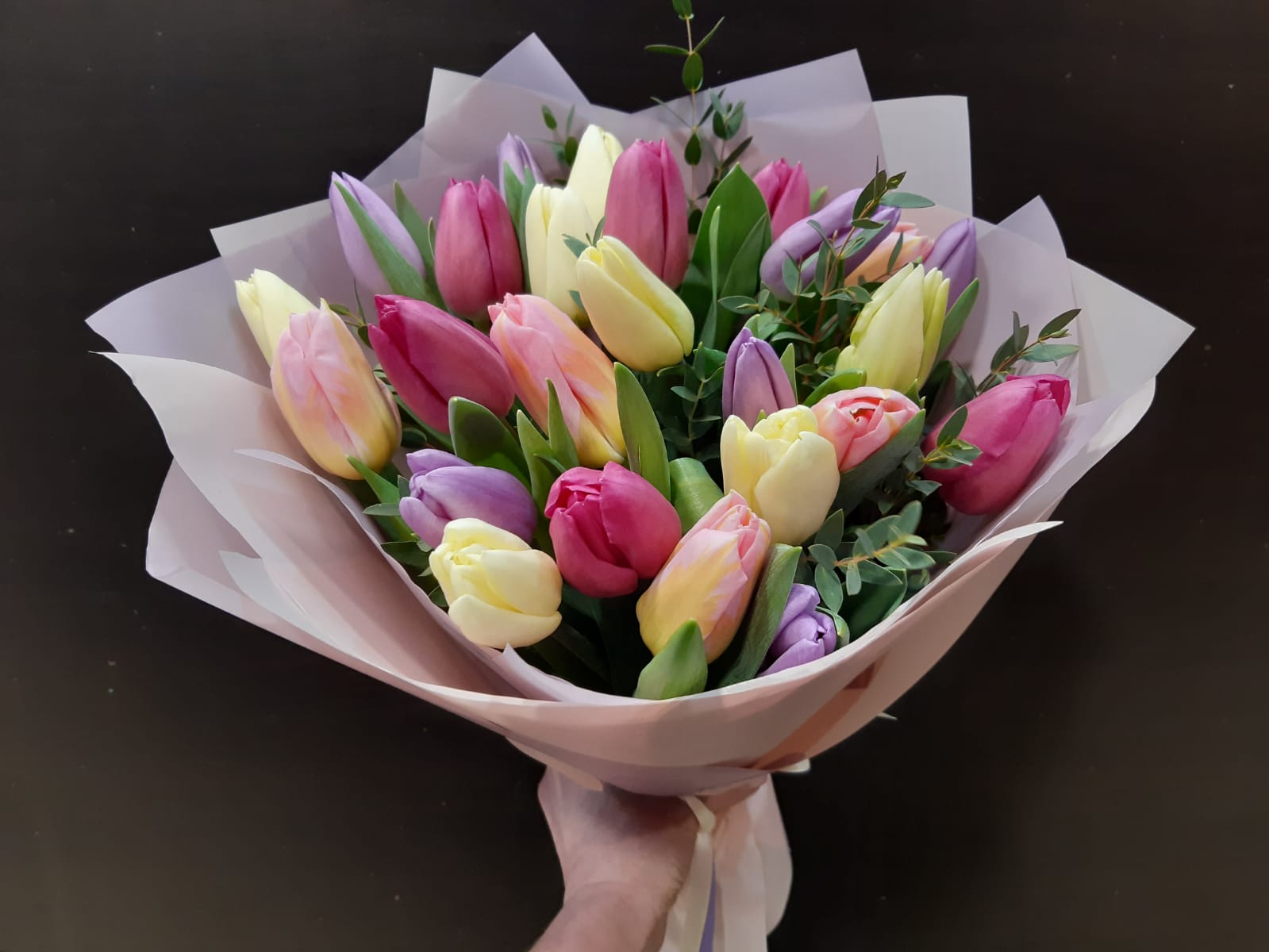 Состав: тюльпаны микс (25 шт.), эвкалипт, упаковка — плёнка.