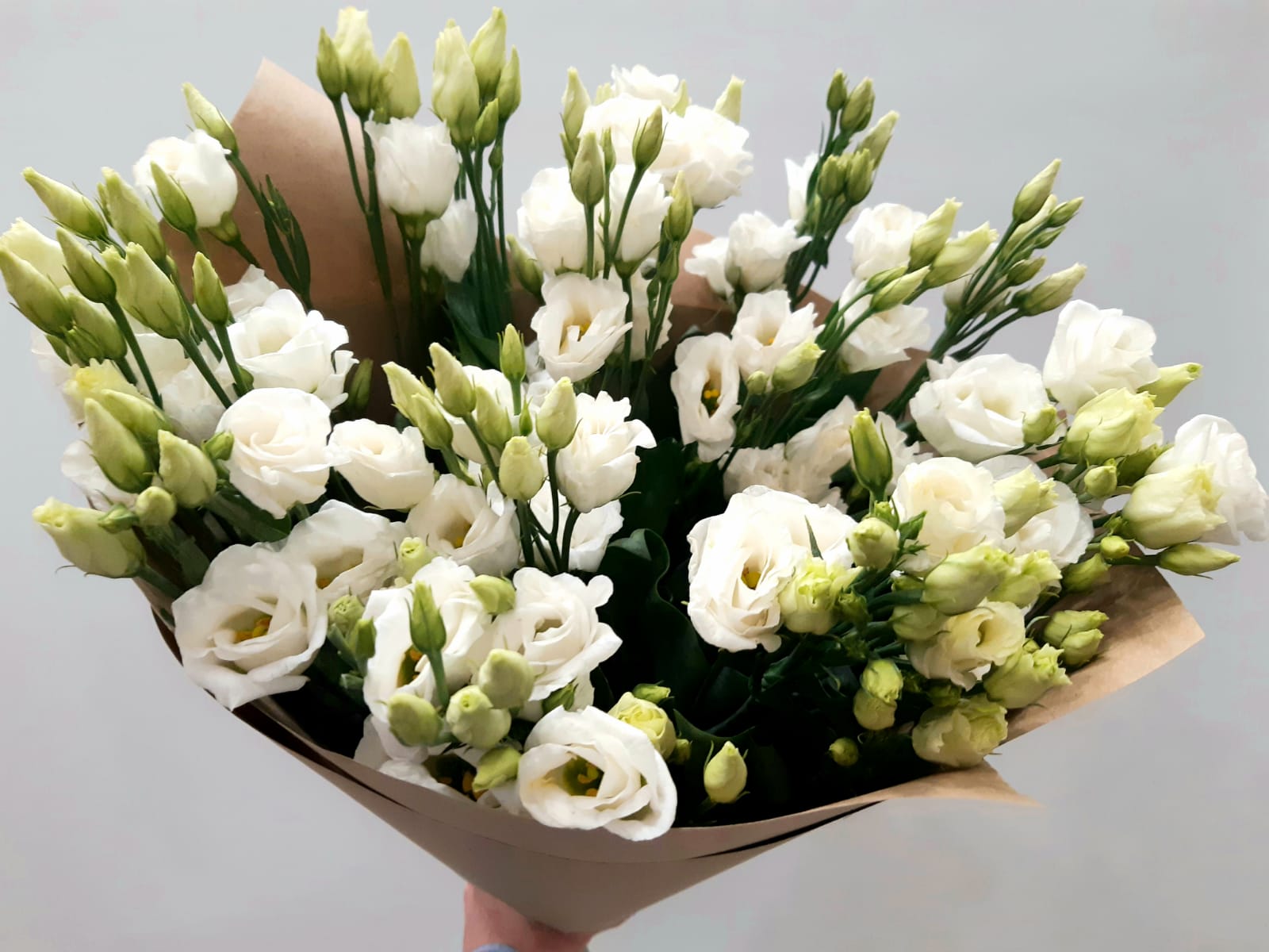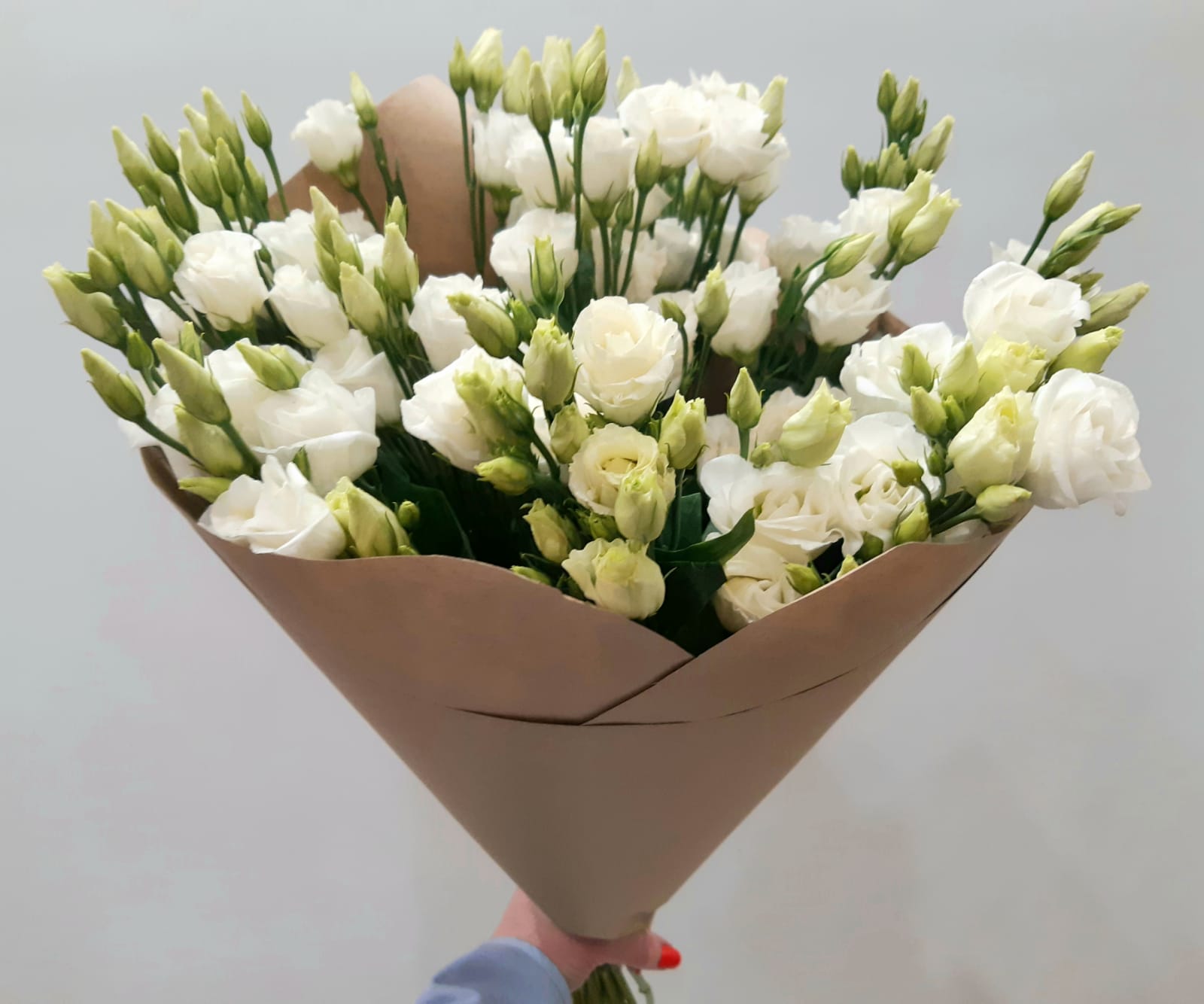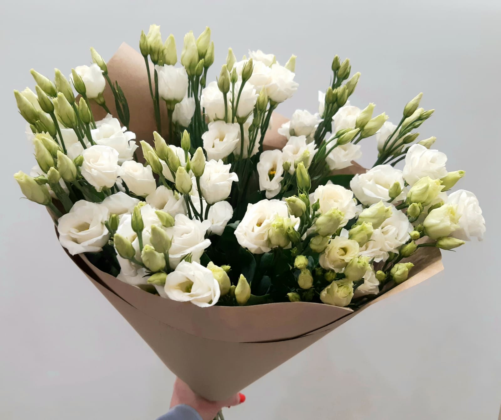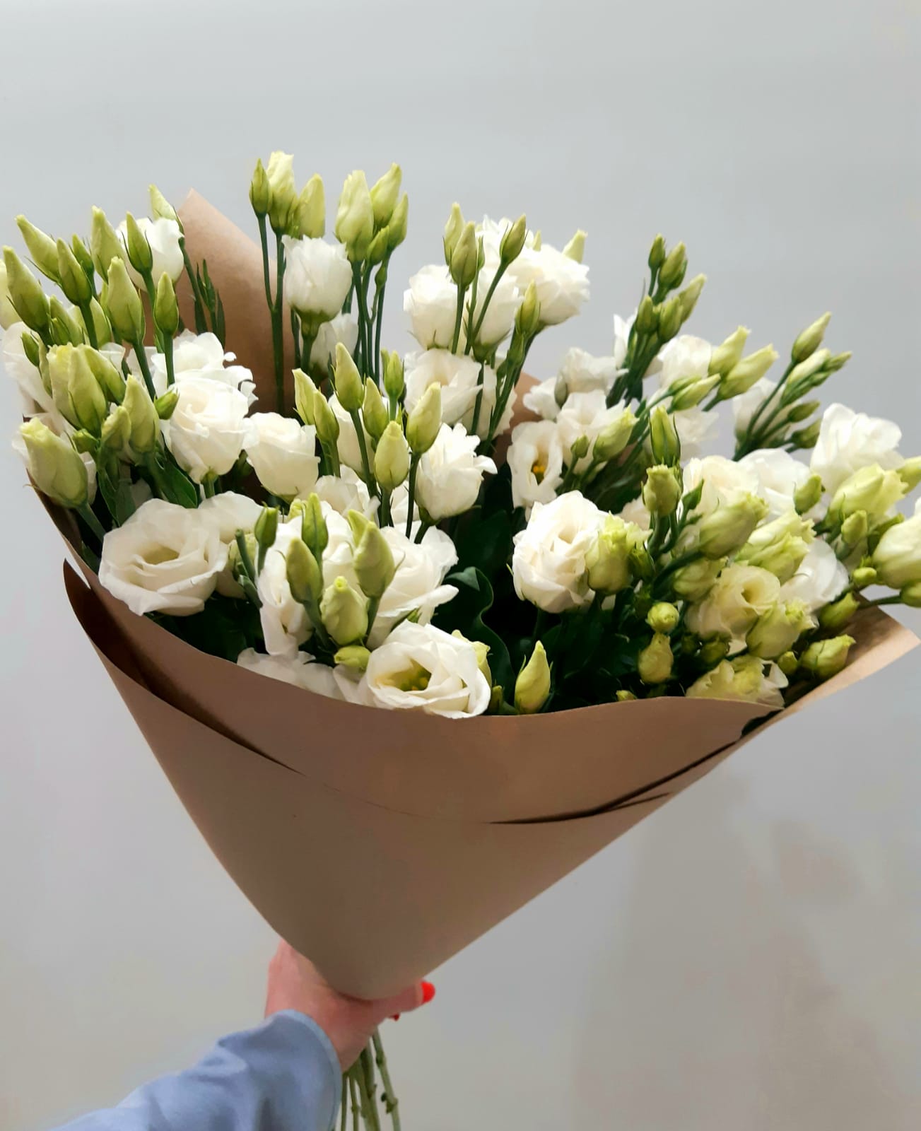 Изысканный монобукет из девяти нежных эустом создает атмосферу трогательной красоты и праздника. Эти утонченные цветы с их шелковистыми лепестками символизируют искренность и гармонию, идеально подходя для особых моментов. Оформление в элегантную крафт-бумагу подчеркивает хрупкое очарование композиции, делая ее универсальным подарком, который говорит о внимании и заботе.