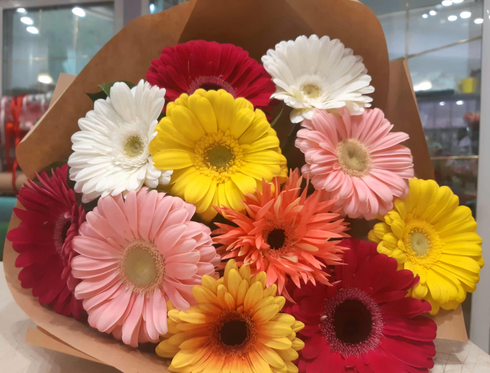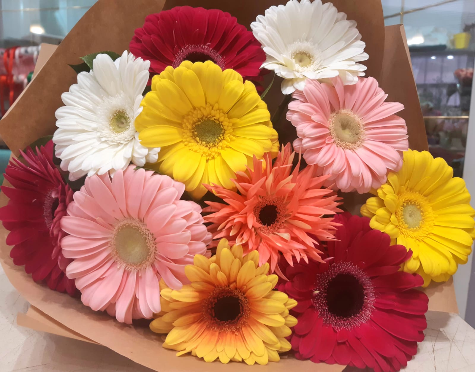Нежный и яркий букет с герберами, который подарит праздничное настроение и ощущение тепла. Одиннадцать разноцветных гербер, напоминающие маленькие солнца, создают жизнерадостную и гармоничную композицию. Обрамление из декоративной зелени подчеркивает сочные оттенки бутонов, добавляя букету легкости и свежести. Упаковка в стильный крафт завершает образ, делая его современным и элегантным. Идеальный подарок для того, чтобы выразить заботу и поднять настроение близким.