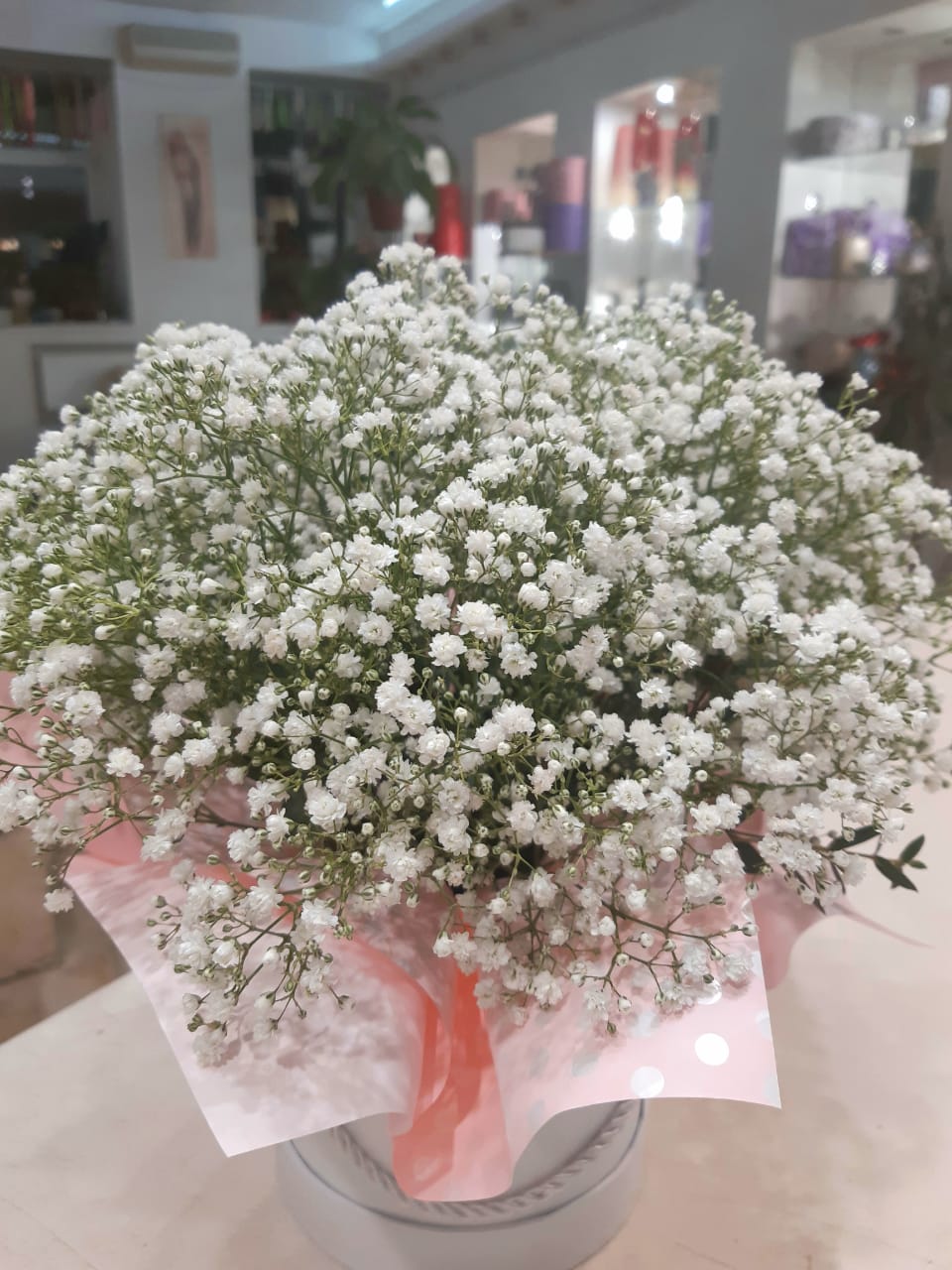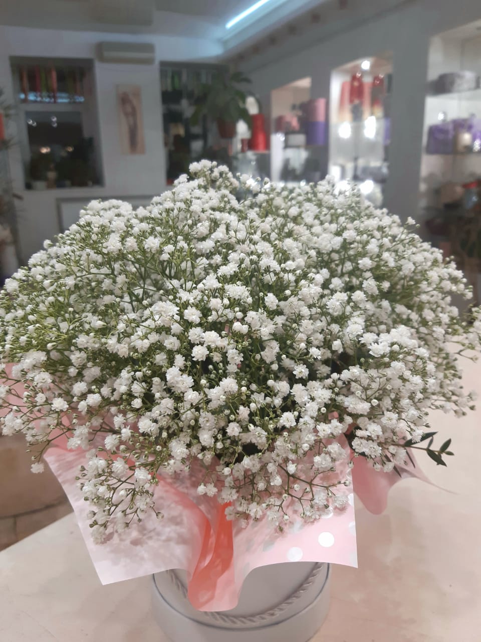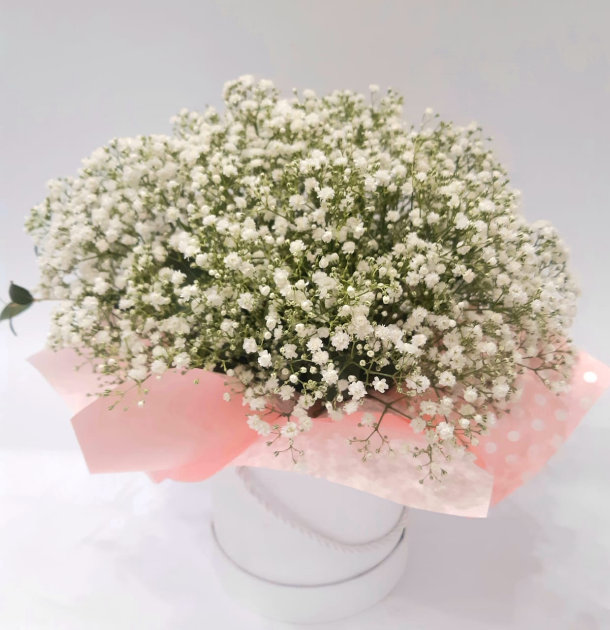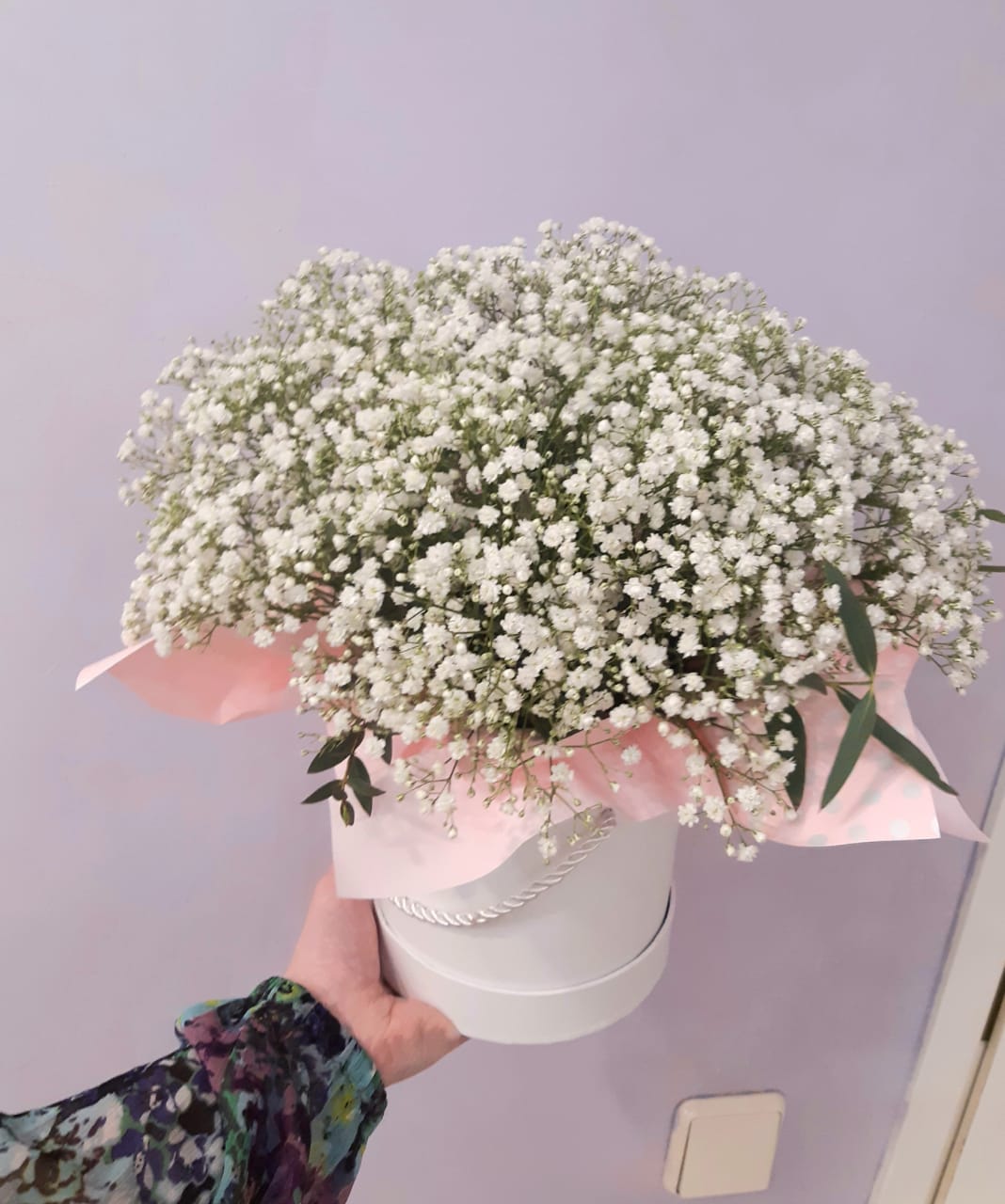 Нежная,воздушная композиция с белой гипсофилой в коробке.