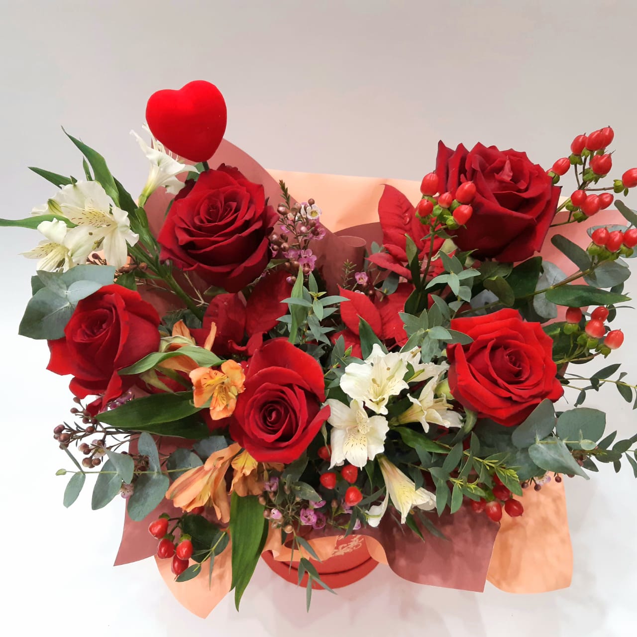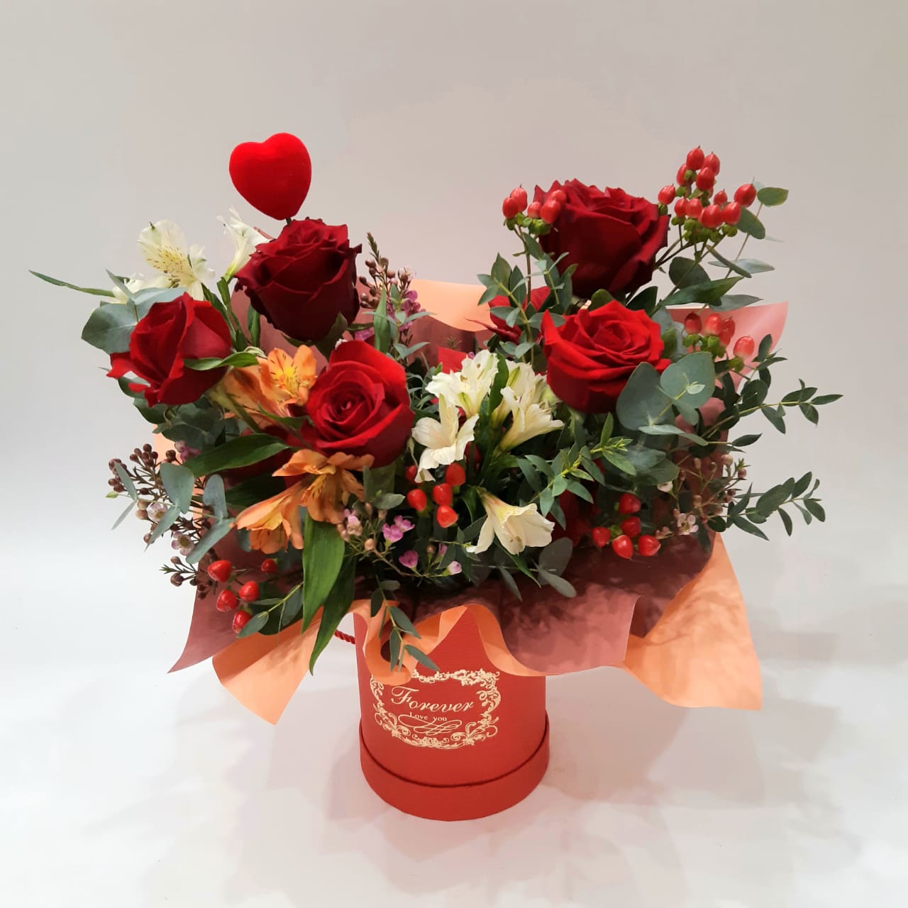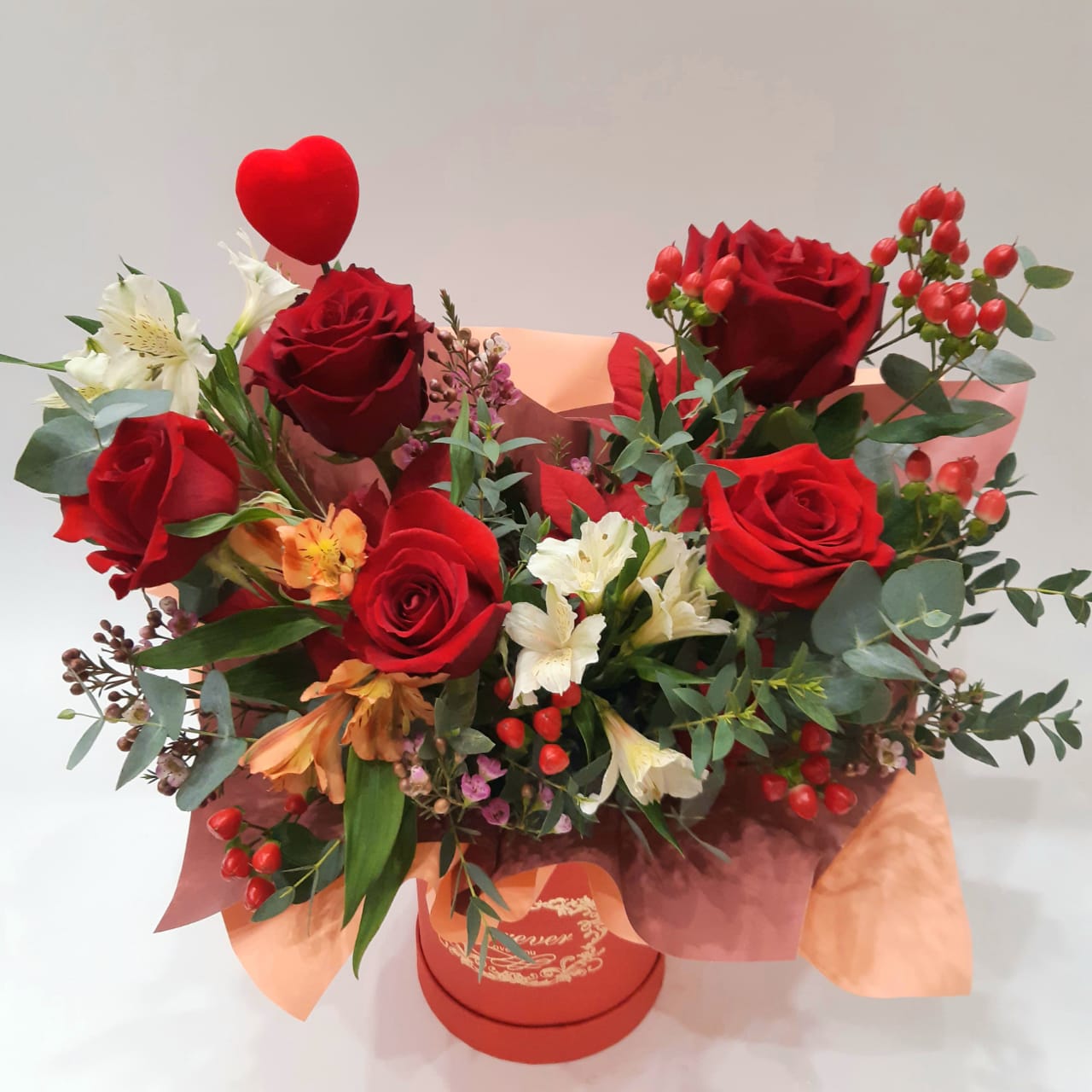 Изысканный и практичный подарок, который сохраняет свою красоту долгое время. Цветы закреплены во флористическом оазисе, что обеспечивает их удивительную стойкость и избавляет от необходимости искать вазу, менять воду или подрезать стебли. Сочетание насыщенных роз Explorer и благородных Red Eagle создает динамичный контраст, а нежные альстромерии смягчают композицию. Для поддержания свежести умеренно поливайте оазис водой примерно раз в 4–5 дней по мере его высыхания. Гиперикум добавляет яркие акценты, а зелень завершает гармоничный образ.
