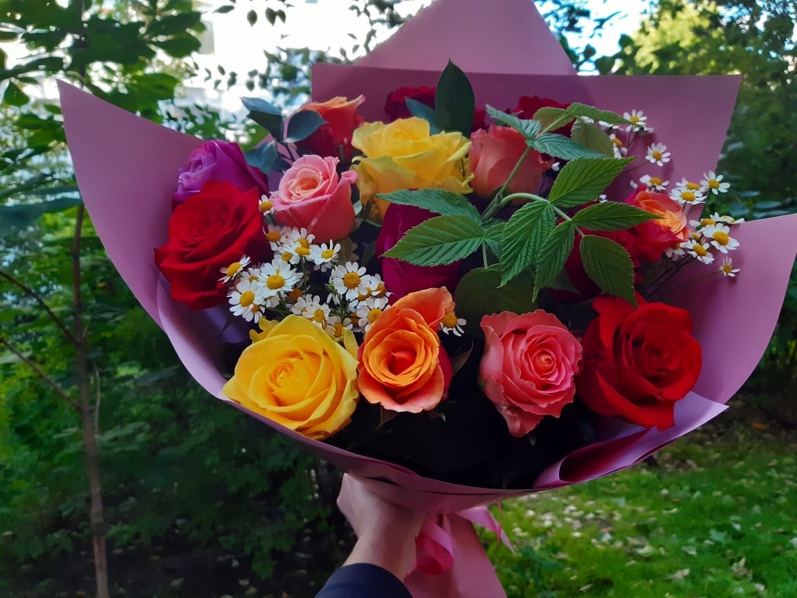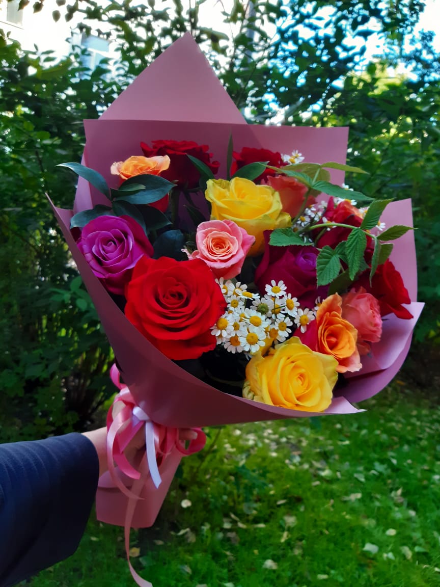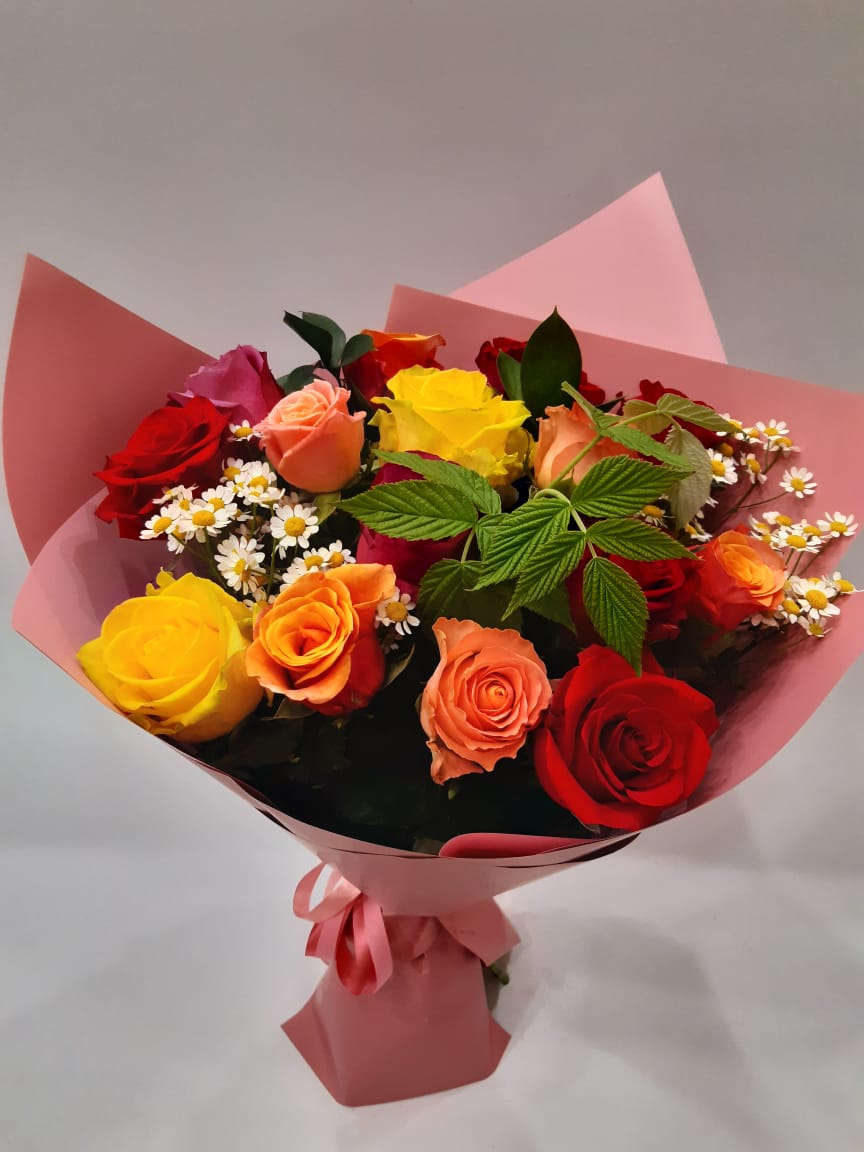 Яркий сборный букет, создающий атмосферу радости и веселья! Сочетание 15 разноцветных роз в обрамлении нежной камиллы и изящного рускуса создает гармоничную композицию, полную жизни и красок. Пышная декоративная зелень подчеркивает богатство оттенков и придает букету завершенный вид. Идеальный выбор для тех, кто хочет подарить незабываемые эмоции и создать праздничное настроение!