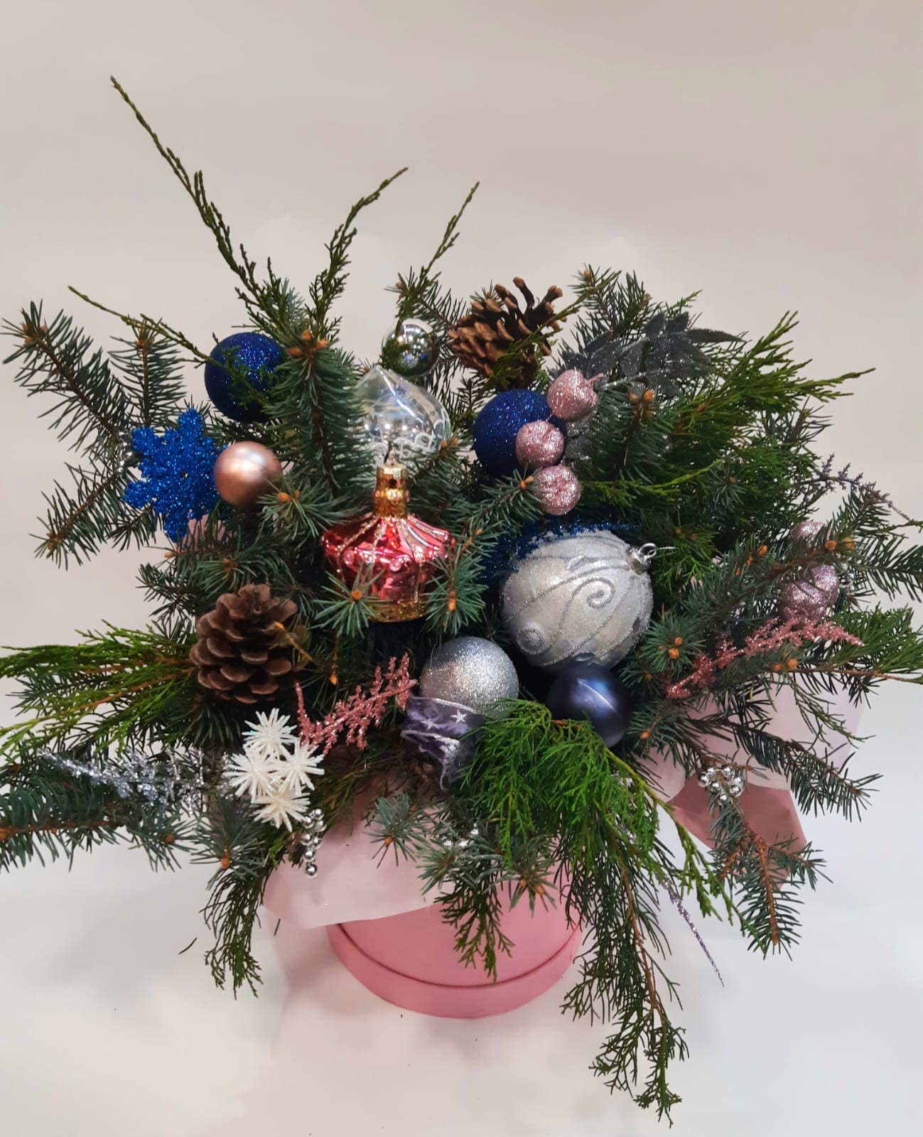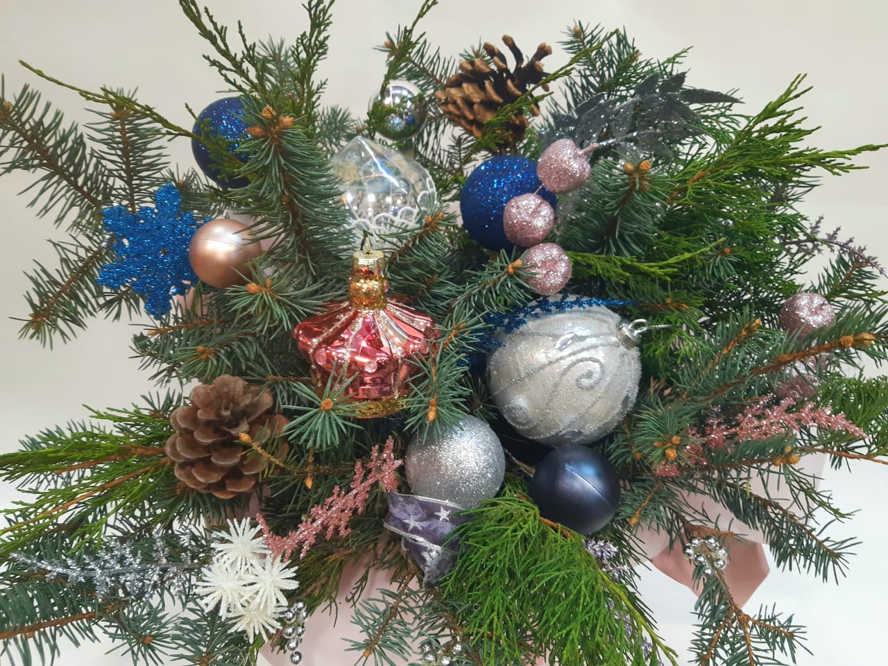 Роскошная композиция из пушистого нобилиса, украшенная нарядными ёлочными игрушками и изящным декором. Этот невероятно красивый и практичный подарок создаст в вашем доме атмосферу настоящего зимнего волшебства. Благодаря использованию флористического оазиса ветки хвои сохраняют свою свежесть и упругость на протяжении нескольких недель. Для поддержания безупречного вида достаточно поливать композицию небольшим количеством воды раз в 5-6 дней по мере высыхания основы.