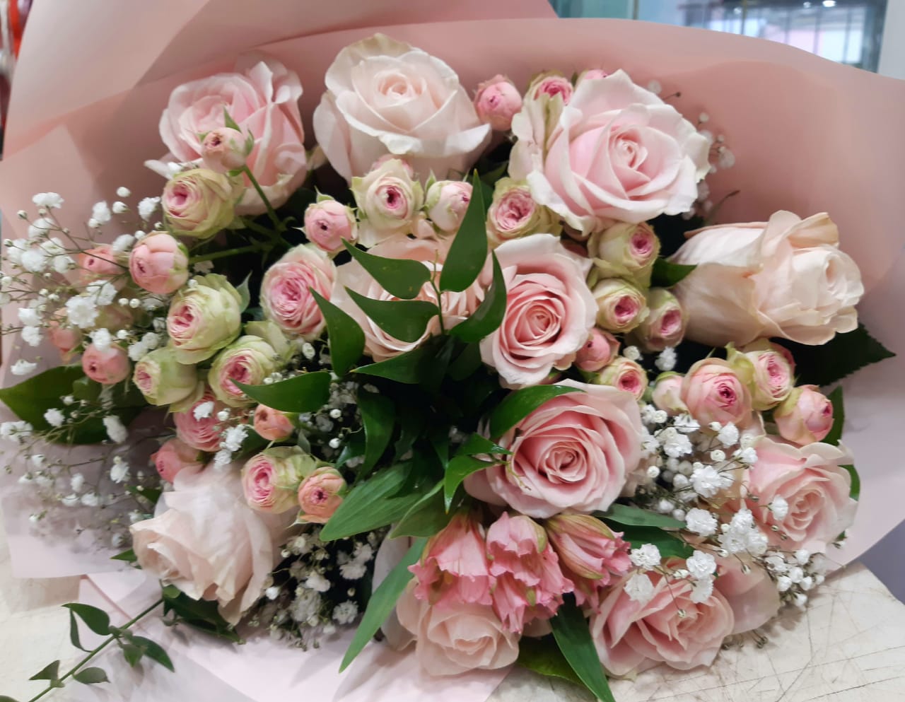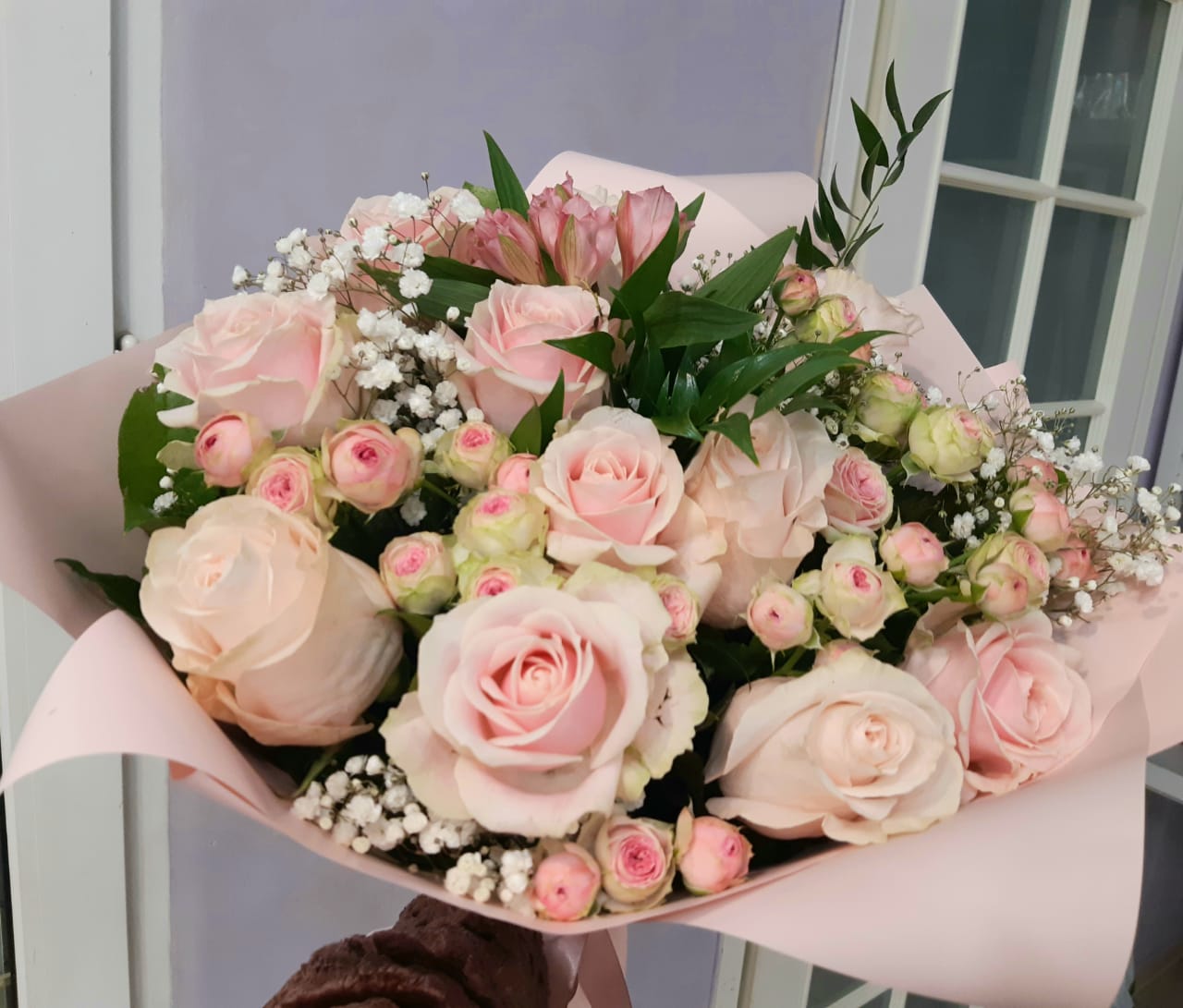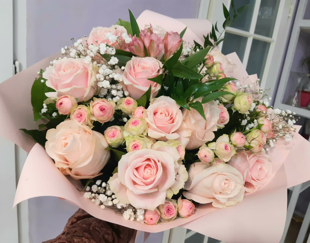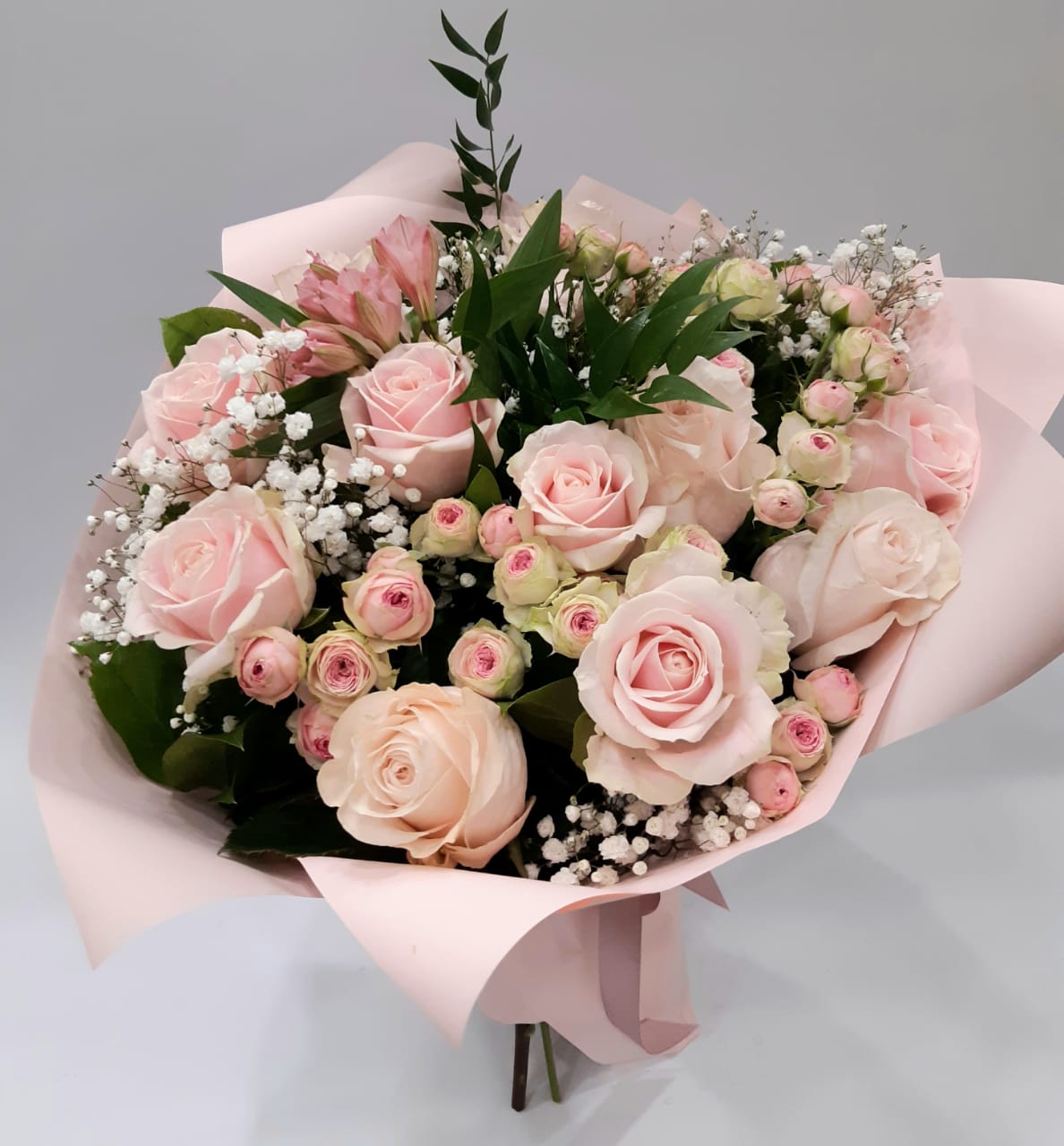 Изысканное сочетание нежных роз Sweet Avalanche и Pomp Rosa с воздушными облаками гипсофилы создает легкую и радостную композицию. Добавление кустовых роз и альстромерии придает букету объем и динамику, а рускус и декоративная зелень завершают образ, наполненный свежестью и гармонией. Идеальный подарок для создания праздничного настроения!