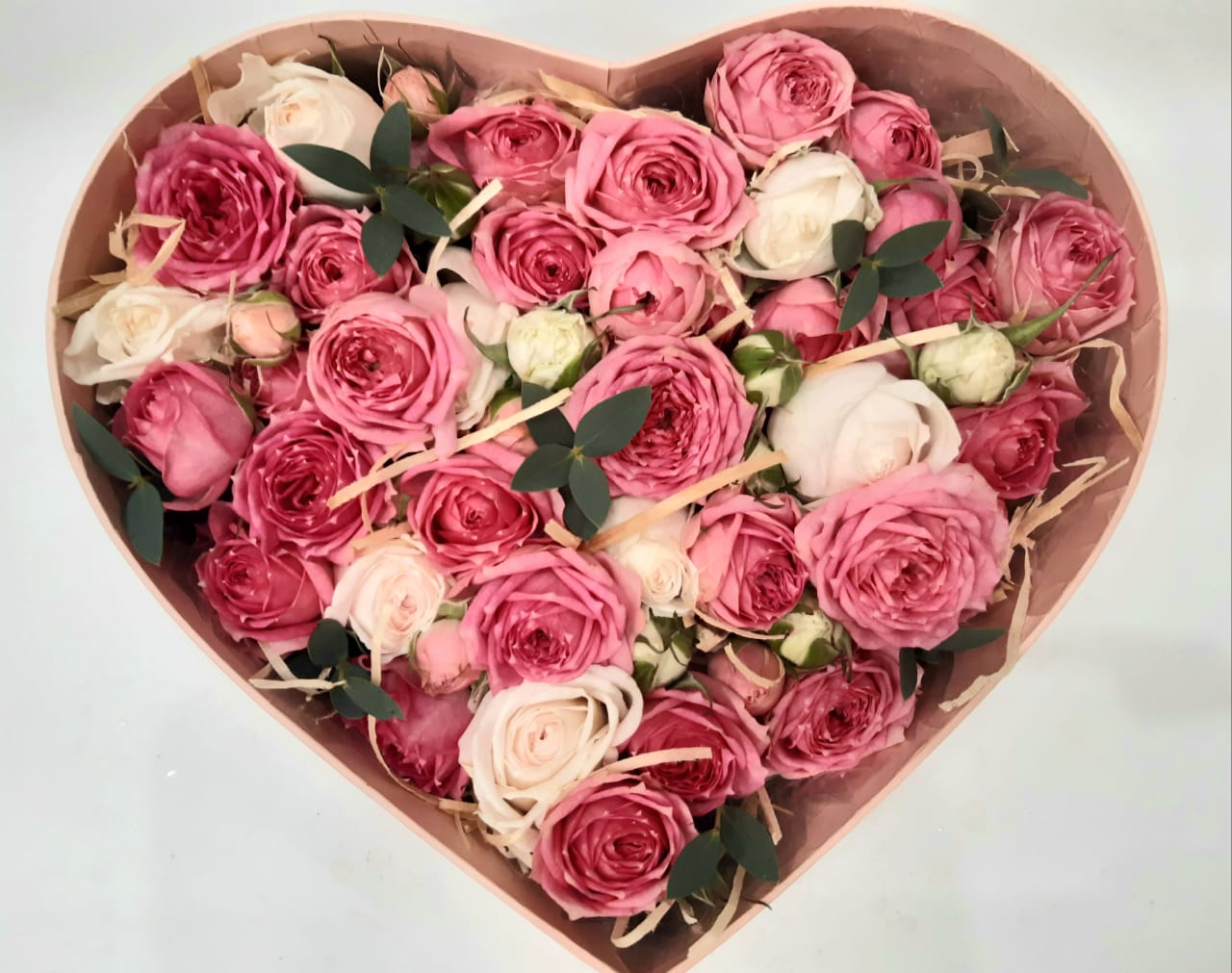 Состав: роза кустовая микс 7шт, эвкалипт,декор,.
