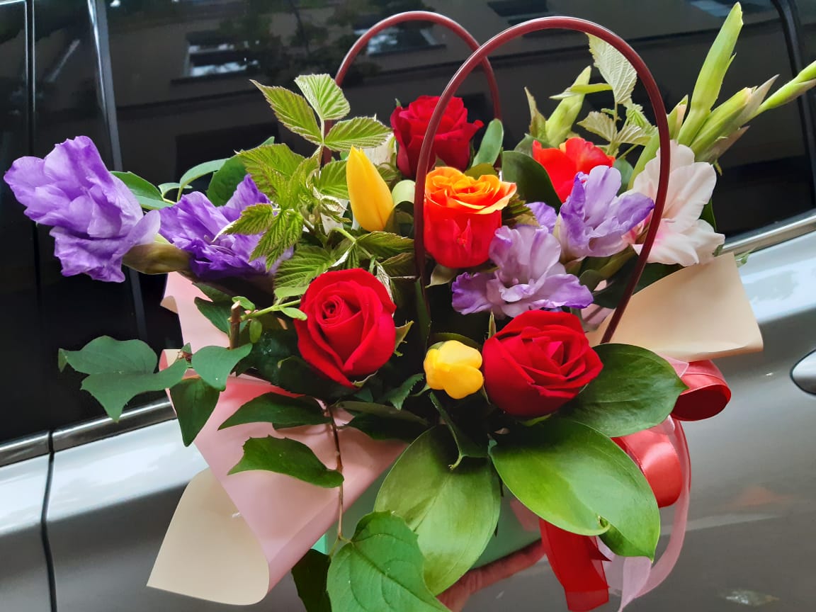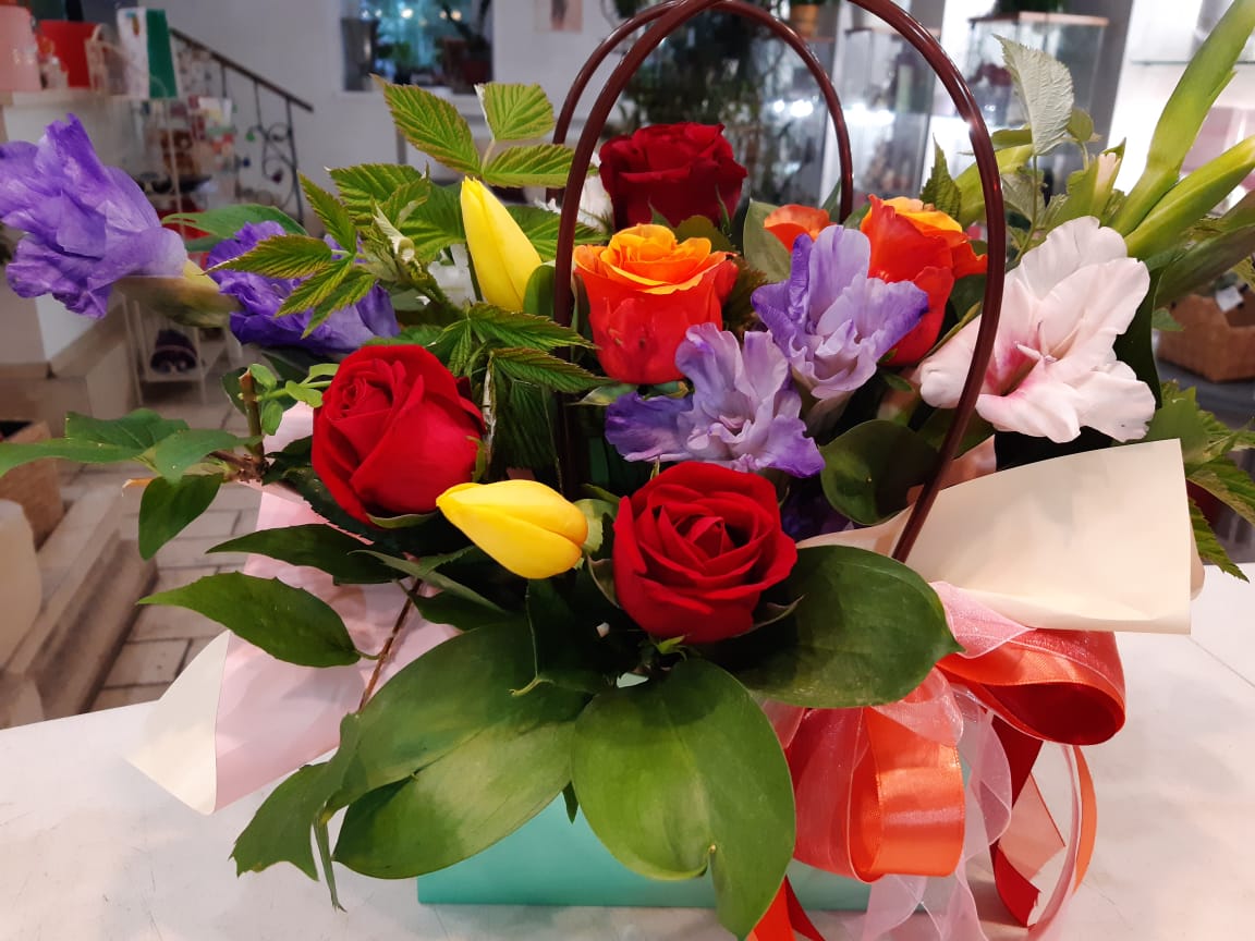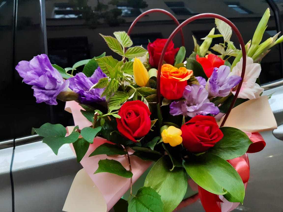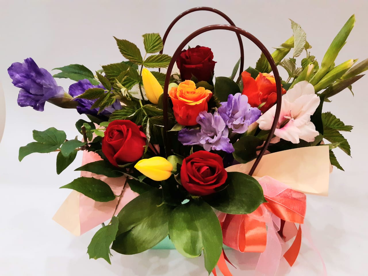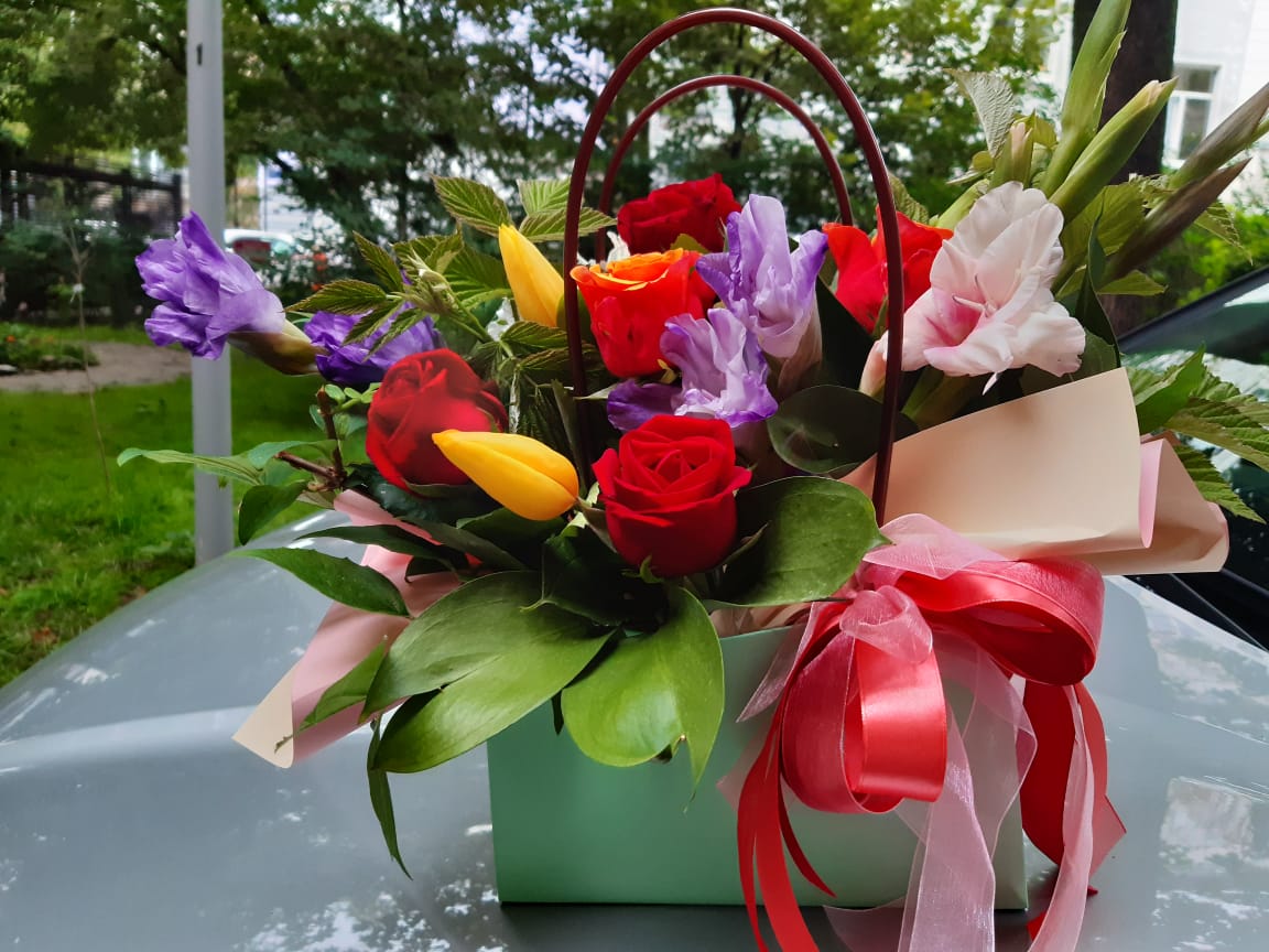 Экспрессивный и элегантный букет для тех, кто ценит яркие акценты и смелые сочетания. Композиция объединяет благородную розу Red Ingrid, классические испанские сорта, нежные тюльпаны и статные гладиолусы, создавая запоминающийся образ в обрамлении декоративной зелени.