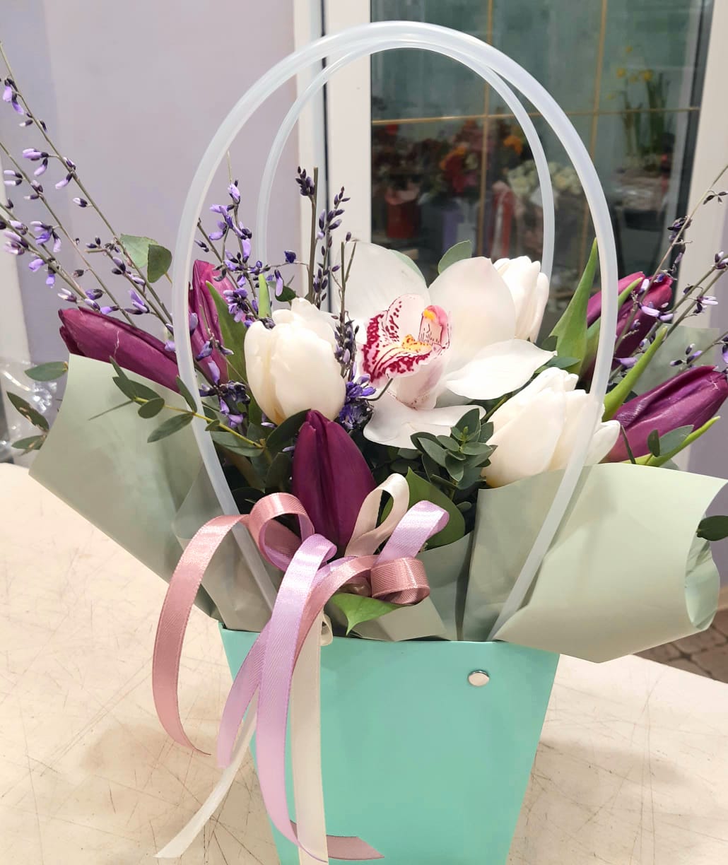 Наш роскошный букет создан для особых моментов. В его составе: семь тюльпанов нежных оттенков, изящный цимбидиум с одним крупным цветоносом и декоративная зелень, подчеркивающая их красоту. Букет дополнен стильной упаковкой, которая идеально сочетается с нежной палитрой весенних цветов. Эта элегантная композиция станет прекрасным подарком, передающим теплые чувства и искренние пожелания.