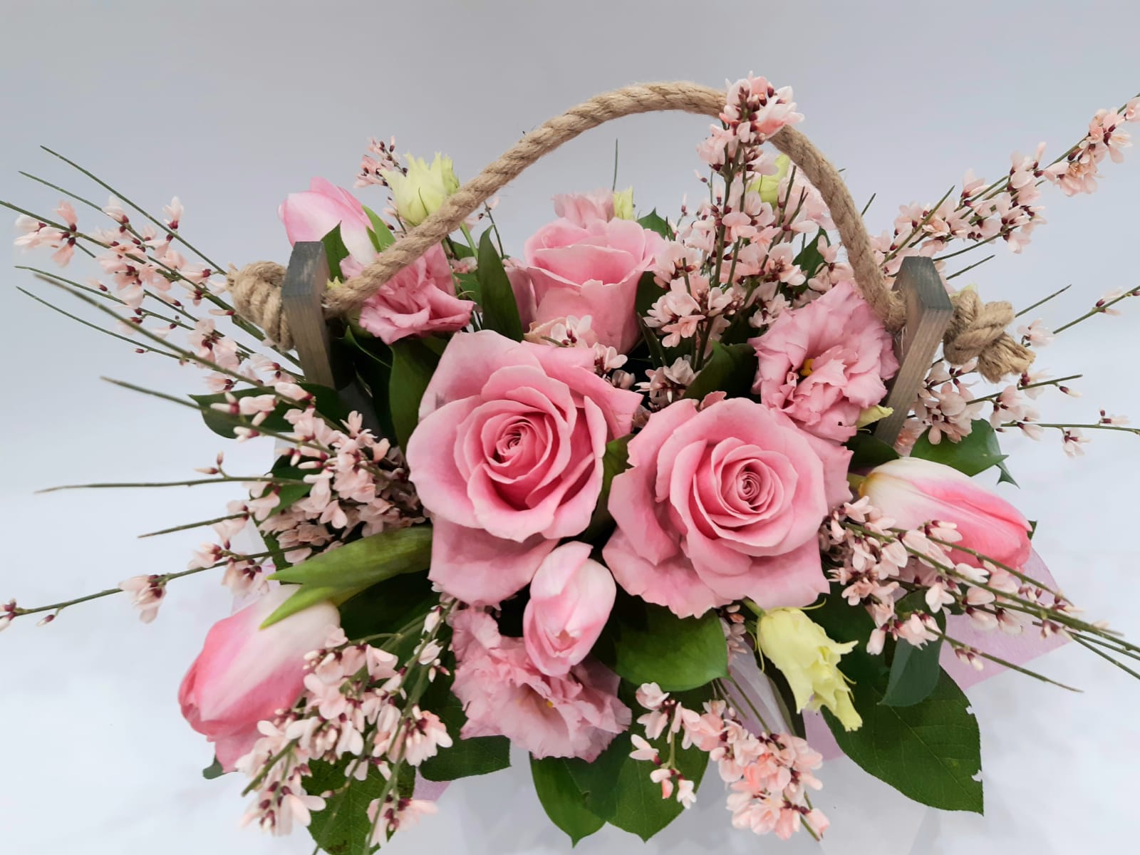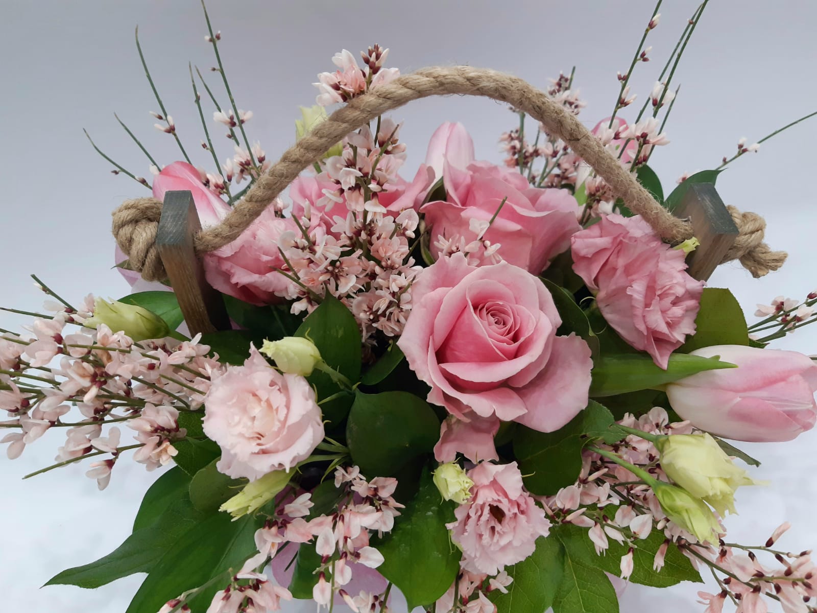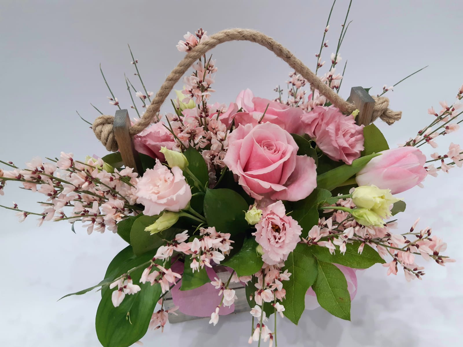 Нежная композиция из цветов в ящике. Очень красивый и удобный подарок. Цветы в оазисе стоят намного дольше и исключает поиск вазы, смену воды, подрезку цветов. Освежать , поливать немного композицию нужно по мере высыхания оазиса (примерно раз в 4-5 дней).
